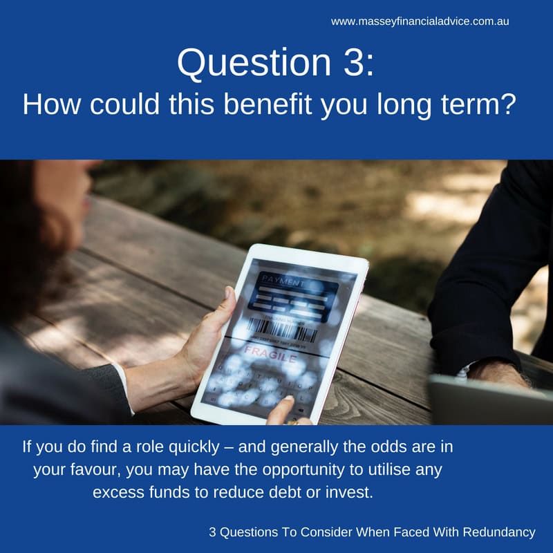 If you are faced with redundancy there are a number of questions you should ask yourself to ensure you are prepared financially for what comes next.